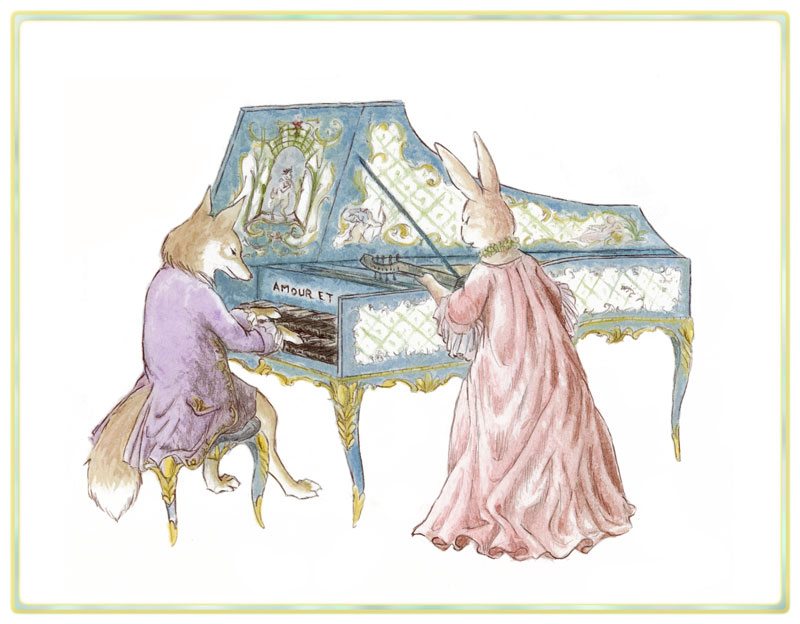 二人の関係は狐とうさぎ。ただそれだけ。 多分フレンチ2段。それかリュッカースのラヴァルマンだと格好いいかな。(適当な) チェンバロのイラストを描くのは、楽しいけど、細部多くてしんどいです。