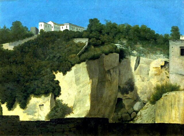 <ナポリ風景、崖の上の建物>