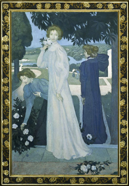前者は美術館だけに、古代調の布を纏った芸術の女神たちが、神殿の建つ聖なる森の中に集うという図像。