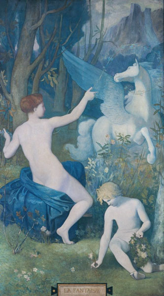 一方で私邸を飾っていたという、<幻想>は神秘な青い色調で統一されていて、森の中でペガサスや裸のニンフ風の女性や少年が意味深に配置されている。幻想とタイトルが書かれた銘板もルネサンスのイメージを借りています。
