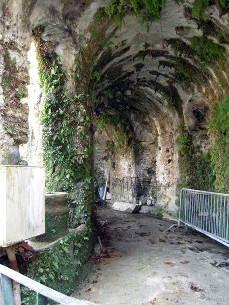 滝の裏側を通り抜ける半円のアーチ回廊。今は通行禁止なのが勿体ないけど、なんてファンシーなんだろう。空想の先では容易に柱の隙間から光の射すこの薄暗い道を歩いて行けます。