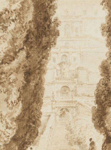 この絵はこの欄干と起伏に富む背景だけでほぼ完結しているけど、描かれていないところで数々の噴水のある下の部分と、手すりの陰になった裏側が、広がっていたのです。