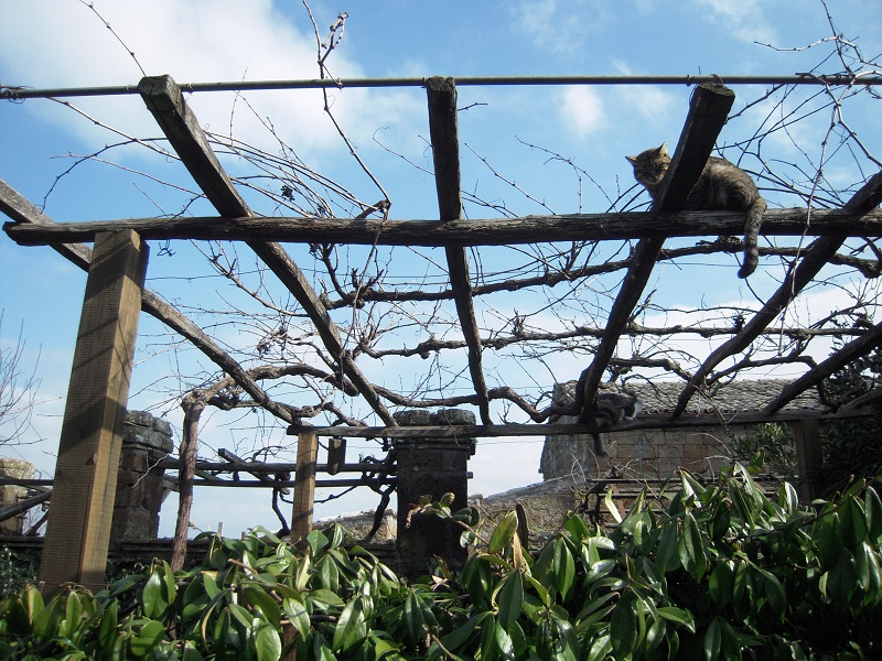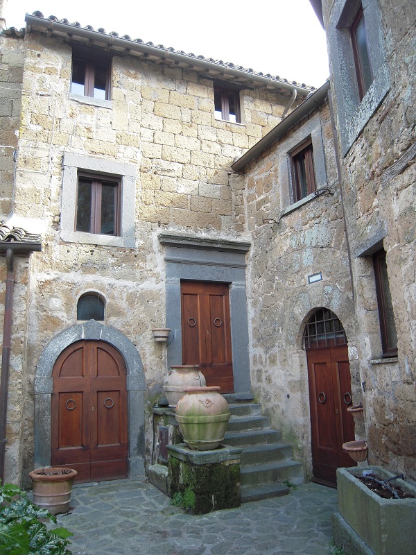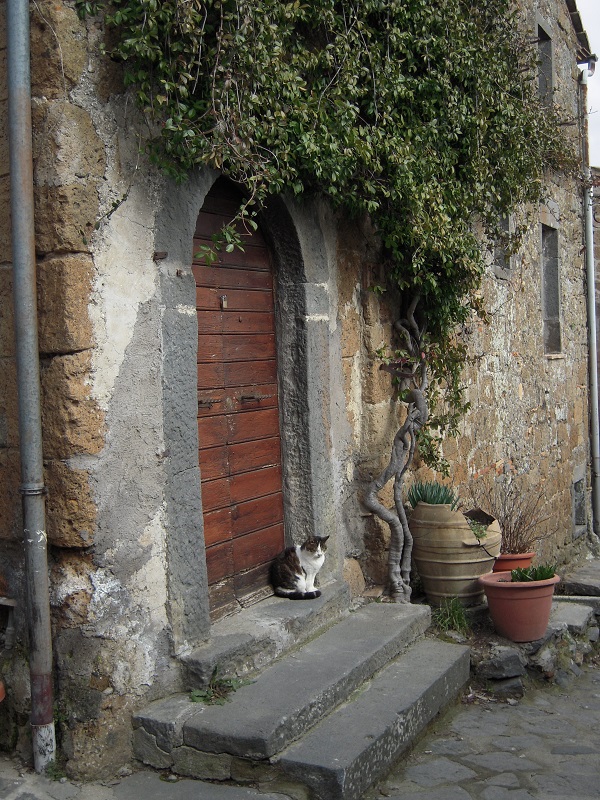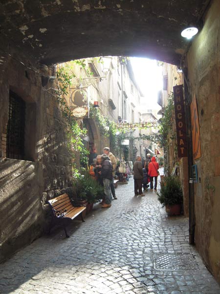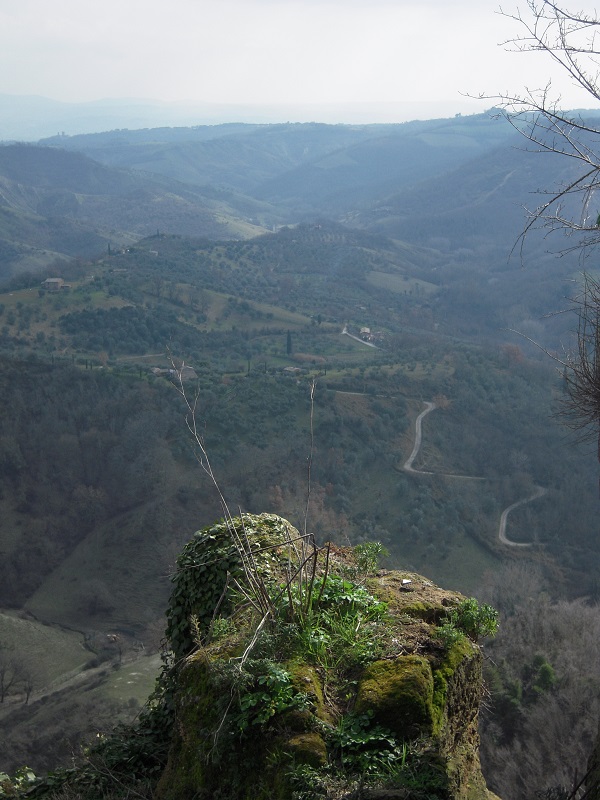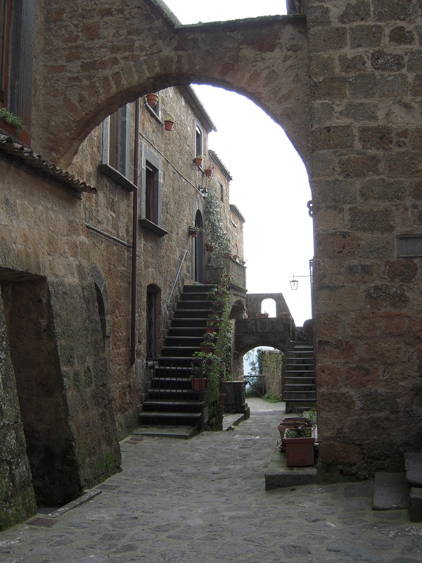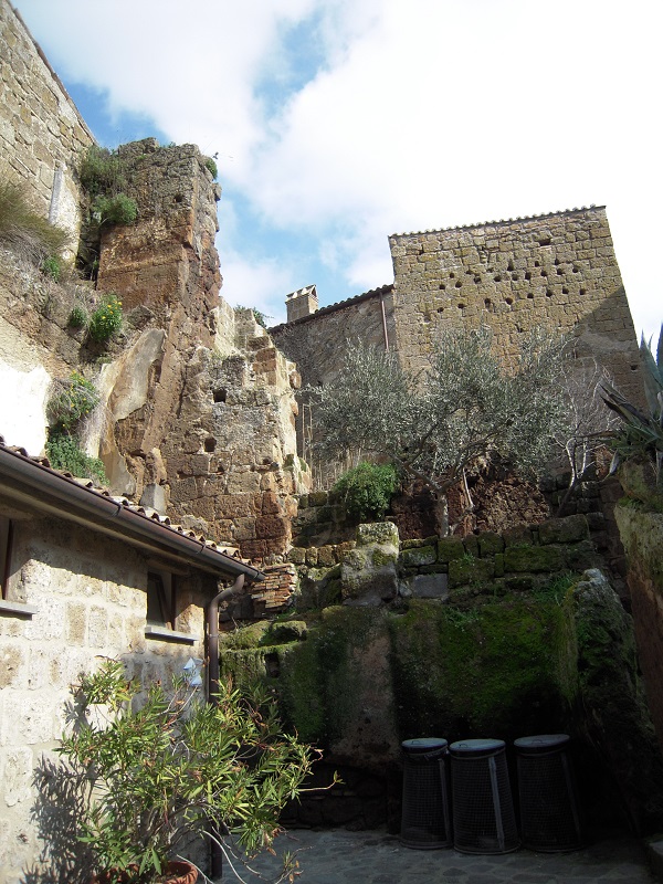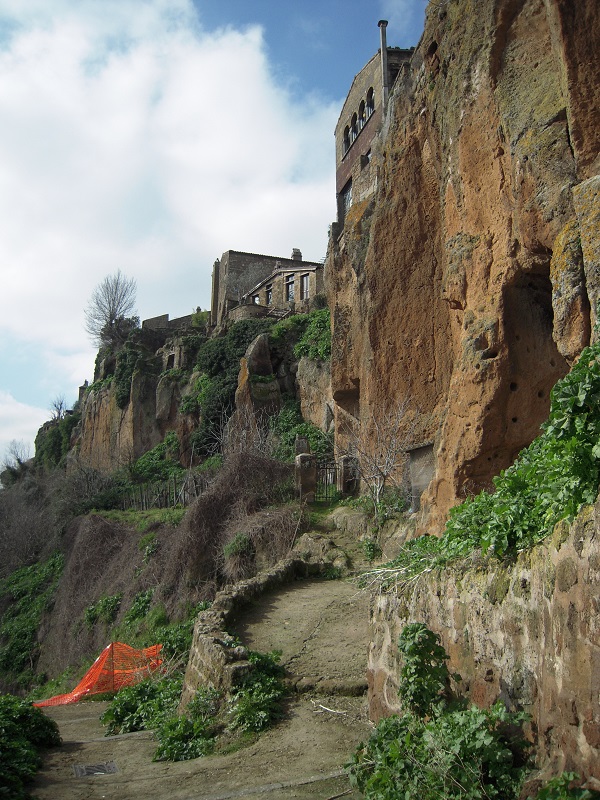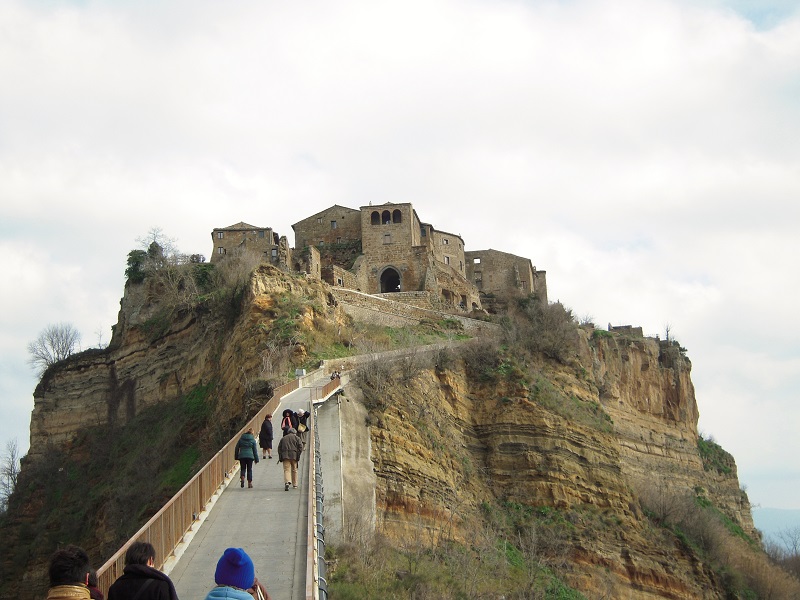 ガイドさんのお話によれば、このような崖の上の町は古代エトルリア人の集落が起源となっているのだそうで、高い所に家々やインフラを築くために、土木技術を磨いてきたのだそう。古代ローマの長大な水道橋とかの建築技術もエトルリア人に学ぶところなのだとか。