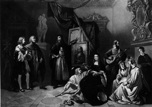 モデルのリザ・ジョコンダを椅子に座らせ、周りには彼女を退屈させないために楽師たちやお女中か賑やかしている。この絵の元ねたになったヴァザーリの魅力的な記述も捏造らしいですが、極めて大真面目に時代考証と空想を巡らして、いかにも本当にあったことのように描かれています。十九世紀には事実と信じられていたかは知らないけれど。