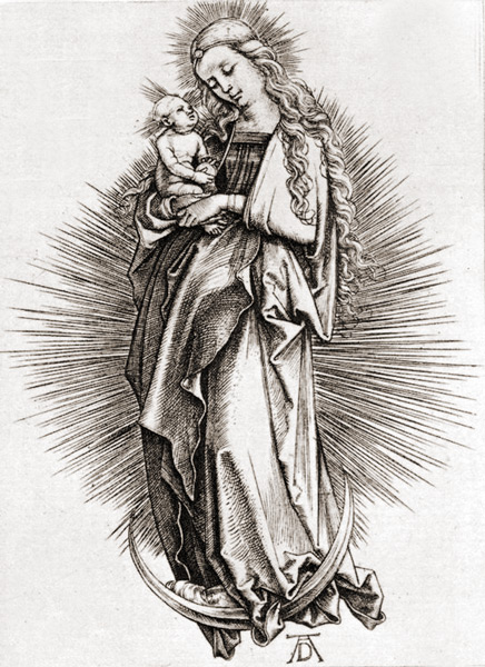 かたや、最新ルネサンスに流行った「安定した三角構図」を見せる、聖母と幼子キリスト。かたや、デューラーの前時代であるゴシックの彫刻のように、豊かな襞を垂らしながらS字に身をくねらせて立つ聖母子。