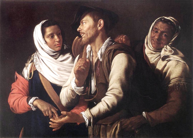 若いジプシー娘の占い師が、客の男の手を懇ろに取り、指先で手の皺をなぞったりして手相を見ている。