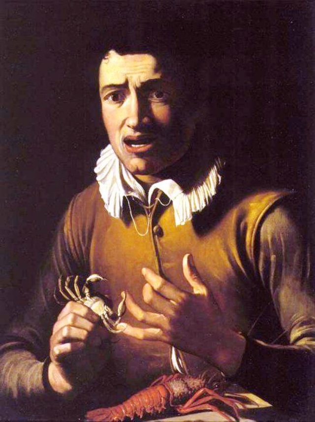 カラヴァッジョのようなリアリティは薄く、これみよがしに蟹を手に持ち、蟹に指先を鋏ませて、カメラ目線で痛そうにしている。「挟むよ…挟むよ…アーッ挟んだ!ご覧ください痛い!」みたく、ちょうどリアクション芸人みたい(笑)