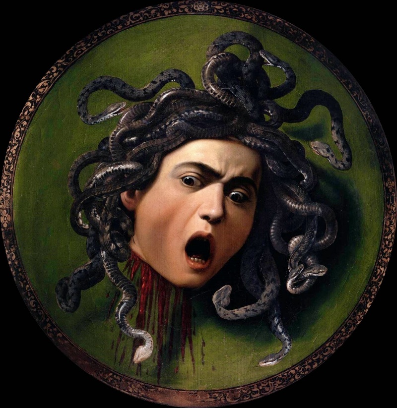 凸型の木の板にカンバスを貼ったものに、血の滴るメデューサの首が描かれている。それでメデューサの、人を石にする首のついた神話のミネルヴァの盾をイメージしている。