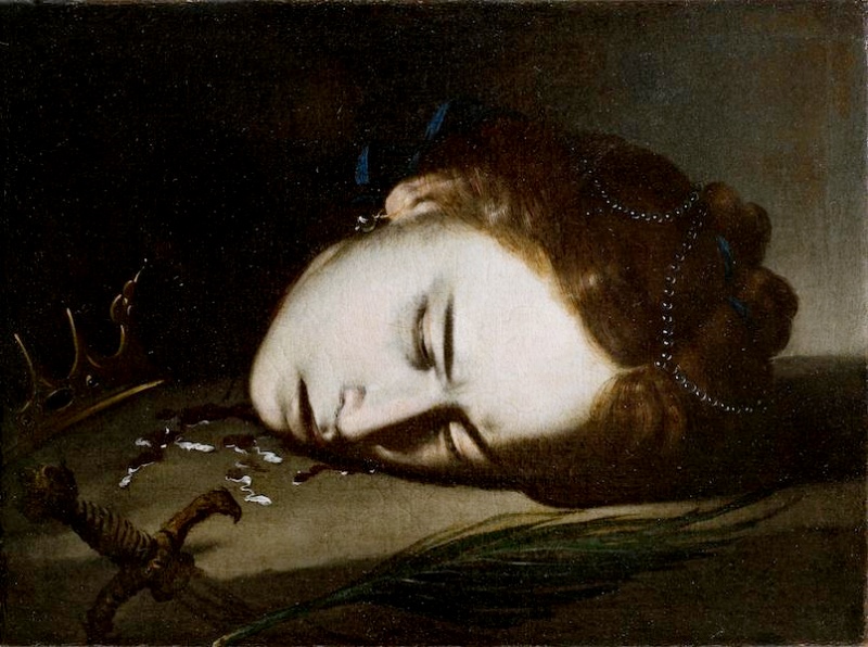 血の気を失った白い肌が目立つ。真珠で飾られ綺麗に結われた髪、虚ろに少しだけ開かれた瞼と唇。目鼻立ちは、まだ死の間際の苦悶の表情をわずかに残していつつも、美しく高貴に描かれている。