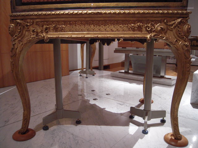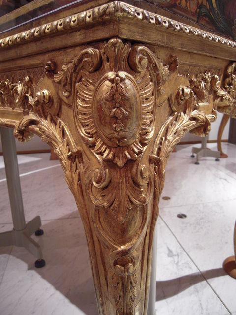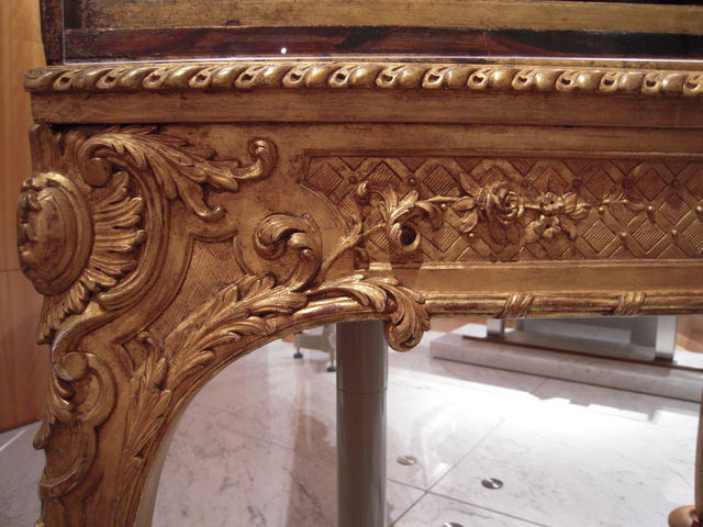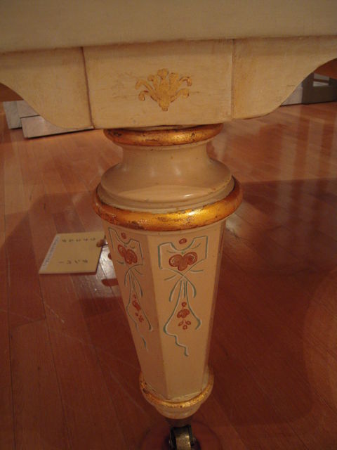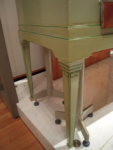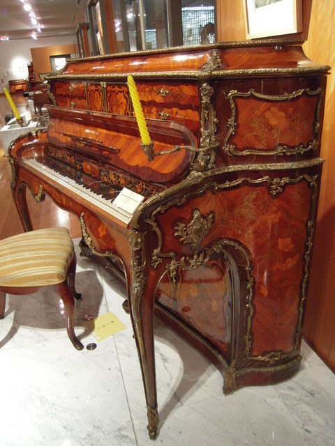 自在な曲線と愛らしい植物モチーフが左右対称を崩さず配され、華麗さと均整を併せ持つ、最末期ロココ様式かなー。生粋の最盛期のロココ様式は、もっと気まぐれで非対称、それも容赦なくかなり意図的に非対称なので、もう次の流行感覚(装飾過多を嫌い、無駄の無い、つまり直線的なすっきりとした均整美を追求する。下のウィーン製ピアノの図を参照のこと)がちょっとずつ現れてきた、ように見えます。