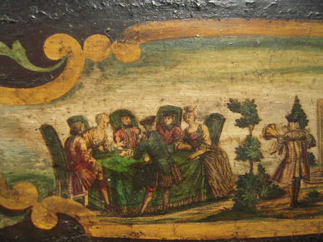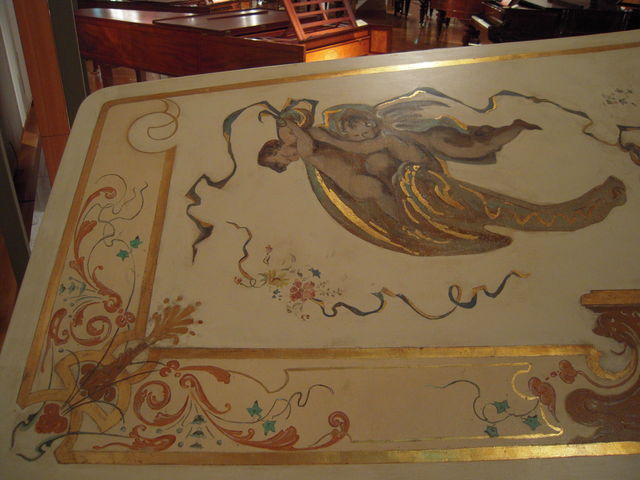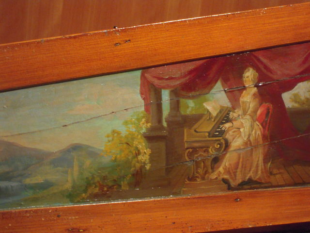 蓋の鏡や、中央のロマンチックな絵といい、こんな小さな箱の中に「女の子らしさ」を満載してくる、ピアノとしても裁縫台としても実用性がいまいち無くなってしまうメルヘンぷりがドイツっぽいと思います。