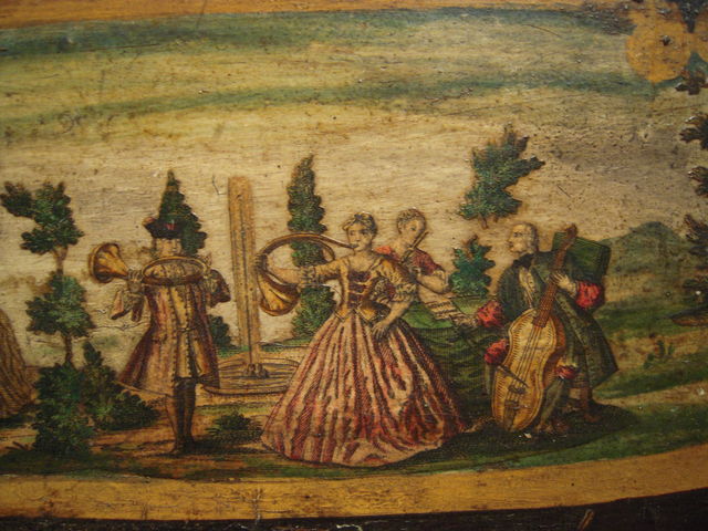 蓋の絵は、当世風の格好をした人が、自然界の縮図のような雄大な風景の中で聞き手もなく演奏している。
