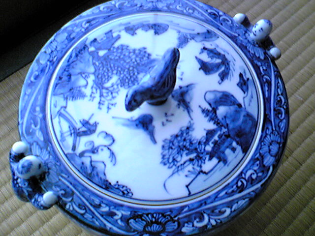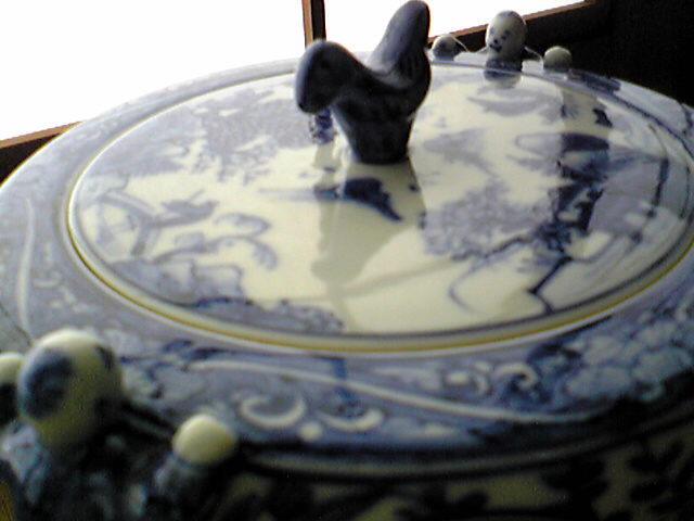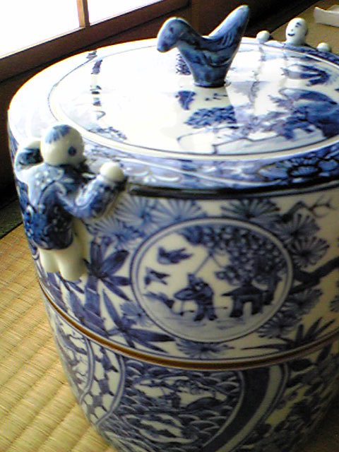 特に目的もなく、井戸の中を覗き込んでいる二人。ゆるーい顔です。蓋の模様は周りの景色の反射かしら。ついでにつまみの部分が水に浮かぶ鳥っていうのも素敵。ちなみに、蓋の裏側には桃が描かれていておめでたい。いや、中国風の記号なのかも。