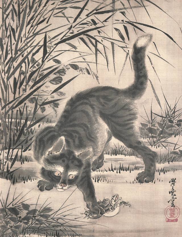ユーモラスな動物や妖怪を描く人ってイメージがあったのだけど、もっと狩野派らしい正統的なのから、浮世絵、ゆるい絵日記、春画に至るまで幅広すぎる画業全体を俯瞰する展示で、暁斎初心者には嬉しい。 〈蛙を捕まえる猫図〉