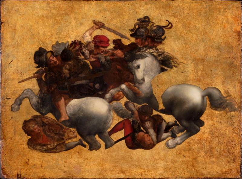 アンギアーリの戦いのように特定の歴史や物語がある訳ではなく、ただ殺し合う人馬入り乱れての乱闘シーン。後脚で立ち上がる馬、刀を振りかぶる人、頭から鮮血を迸らせる人。