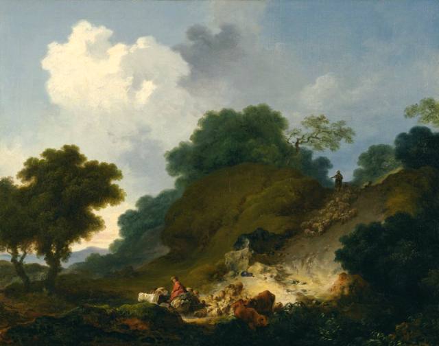 下から荷馬車と空とを同時に見上げるというお洒落な構図。結構フラゴナールはこの視点だけでもダイナミックな構図を気に入っているようで、時々風景画で繰り返している。〈丘を下る羊の群れ〉