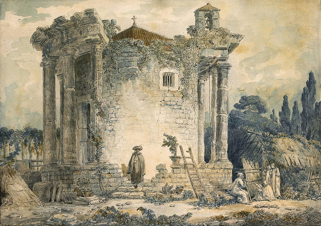 個人的には、気合いの入った油絵より、力の抜けた素描のが上手いと思うのだけど、ともかく「廃墟のロベール」の異名をとるほど廃墟の画家だったとか。